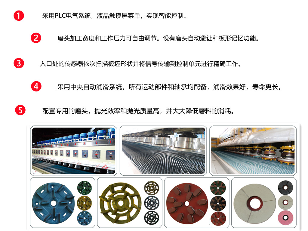 HLMJX-16 型自動石材板材連續(xù)拋光機(jī),配備多個樹脂盤頭和 PLC 控制系統(tǒng),能夠連續(xù)自動地對板材進(jìn)行研磨和拋光,是花崗巖等硬質(zhì)石材表面處理的理想選擇。安裝不同類型的頭,它也非常適合大理石、石英巖和其他石材板材的加工。